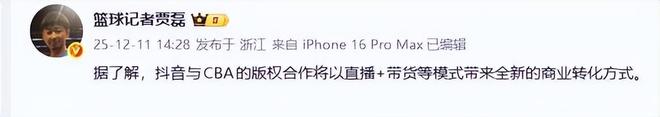 多家媒体和记者确认了这一重磅消息,直播吧独家报道:抖音获得新赛季CBA直播版权,将直播部分场次。看来一些不重的场次没有直播。篮球记者贾磊报道,“抖音与CBA的版权合作将以直播+带货等模式带来全新的商业转化方式。”