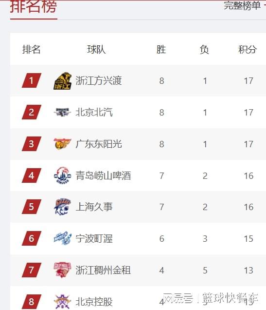 而北京队这一战掀翻广东队以后,他们的战绩变成了8胜1负,排在积分榜第2名。11冠王广东队,他们在输给北京队以后,8连胜纪录被终结,战绩变成8胜1负,排名从积分榜第一下滑到第三。排在积分榜第四名的是青岛队,他们在一度领先浙江队的情况下被对手逆转,最终加时遗憾输掉比赛。球队目前以7胜2负的战绩,排在积分榜第4名,而积分榜第五的是上海队,他们的战绩也是7胜2负。