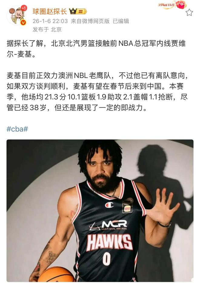 麦基已经快38岁了,这赛季加盟了澳大利亚NBL联赛老鹰队,首秀出战31分钟,全场20中15,得到32分13篮板2抢断3盖帽!目前出战20场,在场均26.7分钟的出场时间里能高效得到21.3分10.1篮板1.9助攻2盖帽1.1抢断,最新的集锦里依然能看到麦基各种暴扣。周琦和麦基的内线组合,太强了。