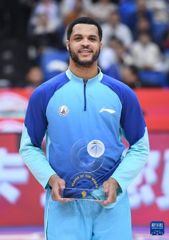 1月15日,青岛崂山啤酒队球员韦瑟斯庞在赛前接受“月度最佳球员”奖。新华社记者 李紫恒 摄