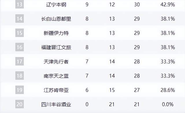 辽宁队作为四冠王,战绩滑落至9胜12负,排名跌至第13位,赛季表现远低于预期。福建队、新疆队、吉林队同为8胜13负,陷入中游泥潭。同曦队(7胜14负)、天津队(6胜15负)、江苏队(5胜16负)与四川队(0胜21负)则深陷倒数深渊,其中四川队已遭遇21连败,创CBA历史最差开局纪录。