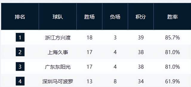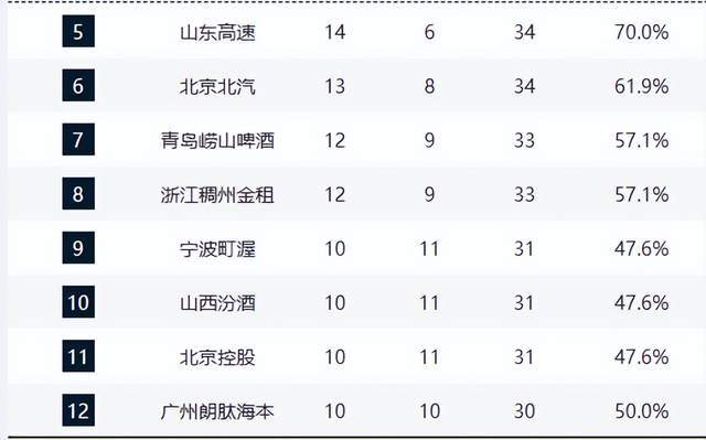 第4至第8名竞争异常胶着:青岛队与浙江队同为12胜9负,分列第七、第八;青岛队遭遇五连败,状态低迷,而浙江队则保持稳定。此五队之间仅差1至2个胜场,任何一场胜负都可能引发排名洗牌。