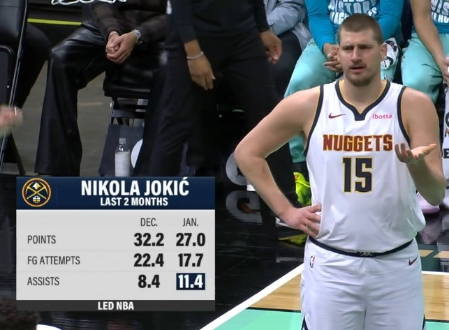 2月2日讯 NBA常规赛,掘金对阵黄蜂。比赛中转播方晒出数据,约基奇最近2个月的个人数据如下:12月,场均32.2分,出手22.4次,助攻8.4次1月,场均27.0分,出手17.7次,助攻11.4次(联盟最多)