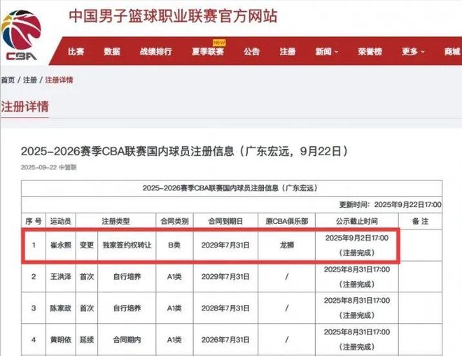 CBA官网更新了2025-26赛季国内球员的注册信息,翻看广东宏远的球员注册情况,可以发现第一列就是新援崔永熙的相关信息——通过交易签约权来到广东的小崔,已经和球队签下了4年B类
