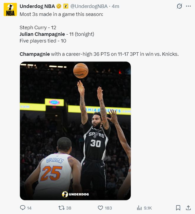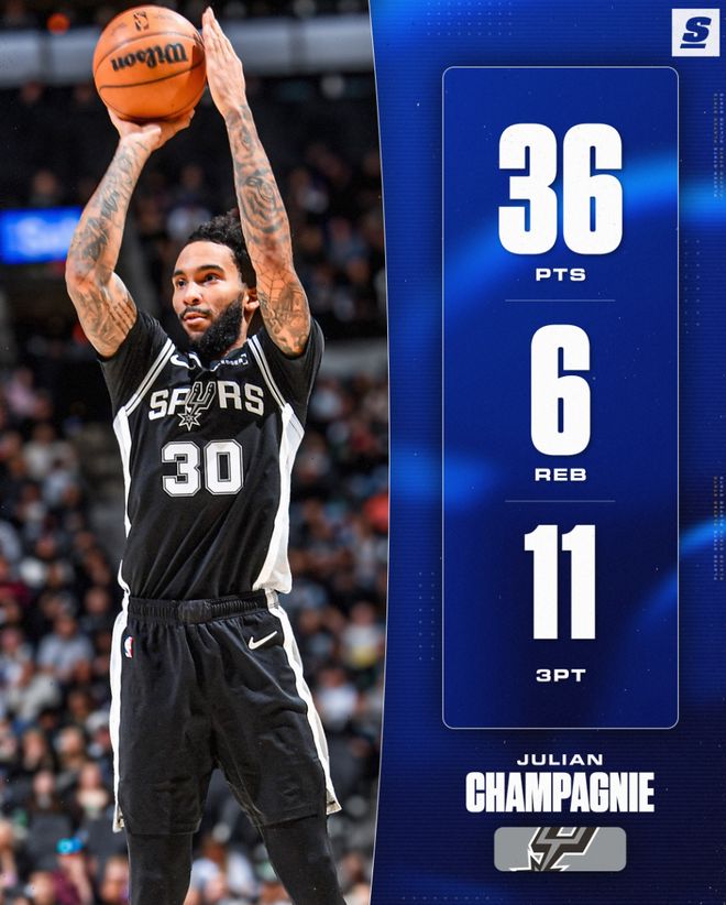 轰36+11三分创九纪录!198秒4记关键3分马刺300万投手一战成名