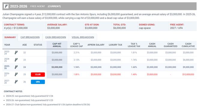 值得一提的是尚帕尼是一位落选秀,他跟马刺签下的合同是四年1200万,他本赛季的年薪是300万,下赛季他的合同还是300万,这位24岁的身高2.01米的投手一战成名了。