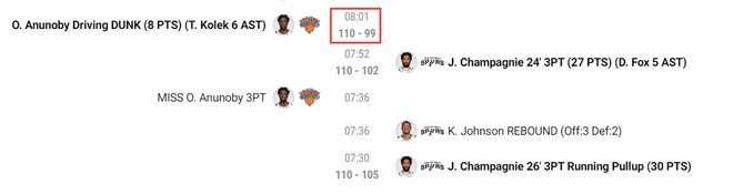 终场前8分01秒阿奴诺比暴扣后尼克斯已经领先11分,随后尚帕尼进入了Zone的状态,7分52秒尚帕尼命中三分,7分30秒再进三分,5分02秒第三个三分,4分34秒第四个三分球,从这里开始两队已经打成116-116,尚帕尼这四个三分太关键了。
