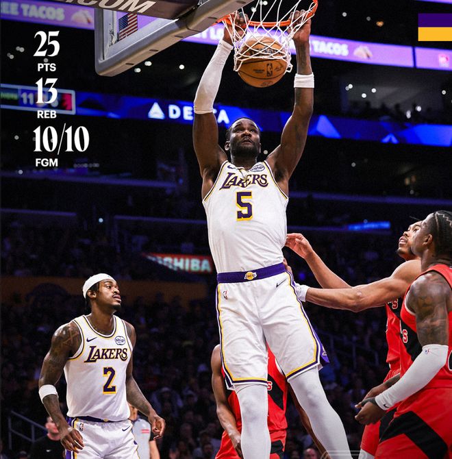 4.艾顿是湖人队史第三位以100%命中率拿到25+10的球员,比肩张伯伦、奥尼尔;