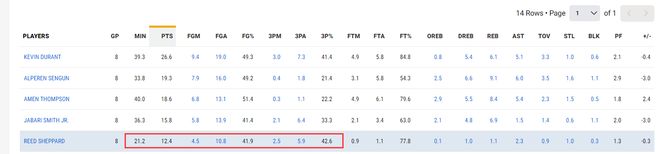 谢泼德这八场比赛场均21.2分钟,拿到12.4分2.3助攻1.1篮板1抢断0.3盖帽,命中率41.9%,三分命中率42.6%,五场比赛合计命中20个三分球,谢泼德的三分产量、三分命中率都是火箭最高的存在。