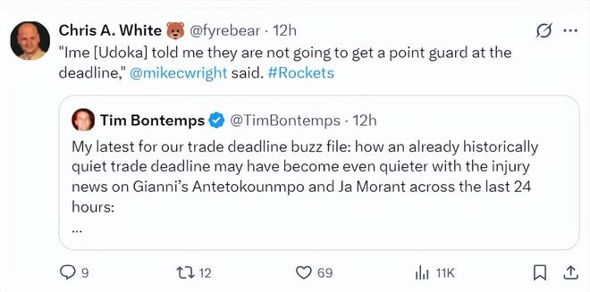北京时间1月25日,NBA记者蒂姆-邦唐,汇总了过去24小时的交易流言,涉及扬尼斯、莫兰特、库明加等多位球员,还有火箭队可能引进的控卫对象。但火箭队记克里斯-怀特转推后回复:乌度卡