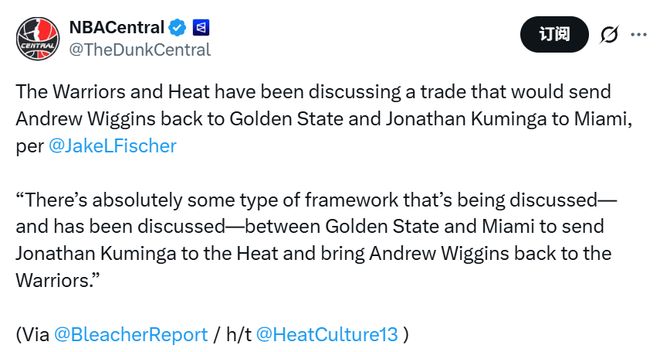 北京时间1月28日,据名记Fischer报道,勇士与热火之间确实正在谈判,而且此前也一直在磋商一套交易框架,核心内容是将库明加送至热火,让维金斯重返勇士。此前,名记Stein曾报道,勇士有