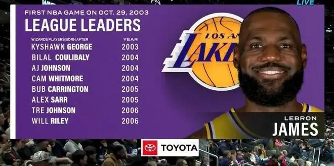 北京时间1月31日,NBA常规赛,湖人142-111大胜奇才。本场比赛,詹姆斯得到20分3板6助。据转播方提供数据显示,在奇才阵容中,有8名球员都在詹姆斯NBA生涯首秀后出生。2003年7月8日,NBA