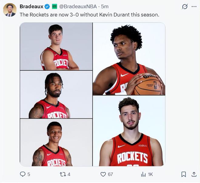 赛后火箭记者Bradeaux写道,本赛季杜兰特缺席的三场比赛火箭队3胜0负,从这个层面来看火箭与杜兰特是相互成就,火箭队根本不是专业啃老的年轻球队。