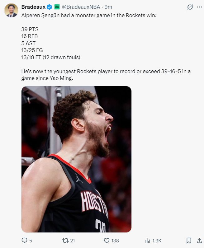 火记Bradeaux写道,申京成为姚明后最年轻在一场比赛中至少39+16+5的球员。