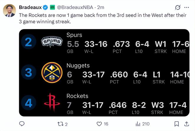 这一波三连胜后,火箭31胜17负,胜率64.6%,火箭队距离西部第三的掘金只差1个胜场,火箭队又有希望去染指西部前三了。