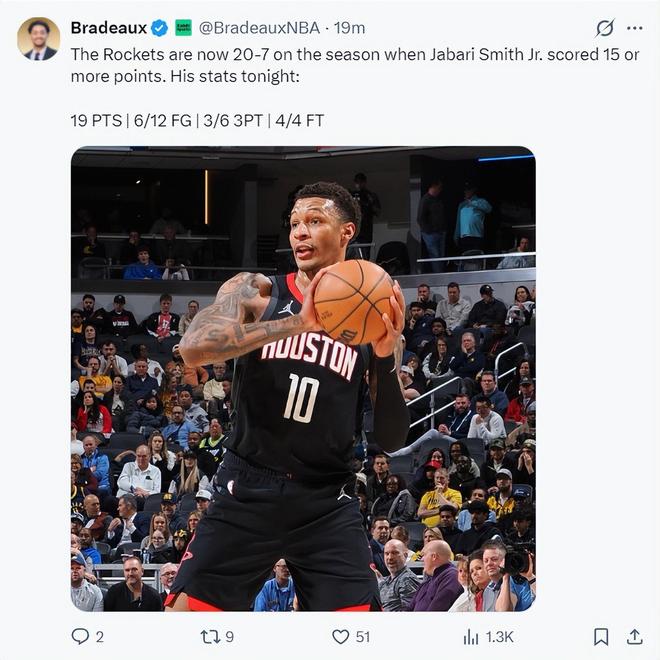 火记晒出小贾此役12中6+三分6中3拿到19分的数据,他写道:当本赛季小贾至少能拿到15分时火箭队战绩20胜7负,看起来小贾也是火箭胜负晴雨表。