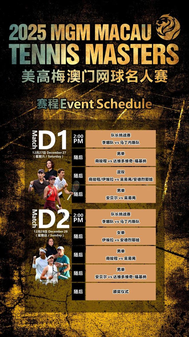 - 2025美高梅澳门网球名人赛将于12月27-28日在澳门综艺馆盛大举行!亚洲冬季最炙手可热的网球盛事即将开打。同...发表于: 12-28 20:21