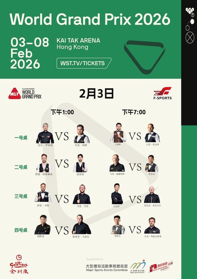 2026年2月3日至8日,世界斯诺克巡回赛(WST)排名赛——斯诺克世界大奖赛2026将在中国香港启德体育园回归。