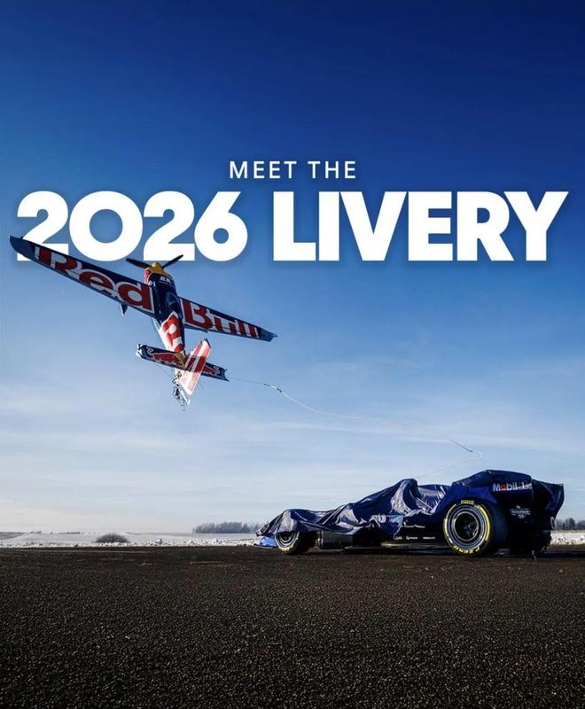 2026红牛F1车队的新款RB22赛车正式揭晓,正常人都知道正常红牛肯定不会“正常”搞个发布会。于是大家看到一辆车蒙着布,停在那里,突然,斜刺里飞来一架小飞机,尾钩挂住蒙布,飞机一个大角度爬升,新车亮相。