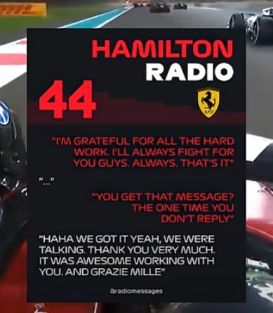 然而,到了赛季收官战阿布扎比大奖赛时,公开的TR片段再次被媒体和粉丝高度关注。根据公开可见的TR内容记录,汉密尔顿在赛末为整季努力作简短致谢后,说出了“你收到那个信息了吗?你这次不回复……”这样的话,随后阿达米以类似笑声和较为轻松的句式回应。媒体报道将这一段作为两人沟通节奏不一致的又一例证,而老汉粉丝则将这段TR片段作为冲突象征,认为这是两个长期“互不理解”的信号。