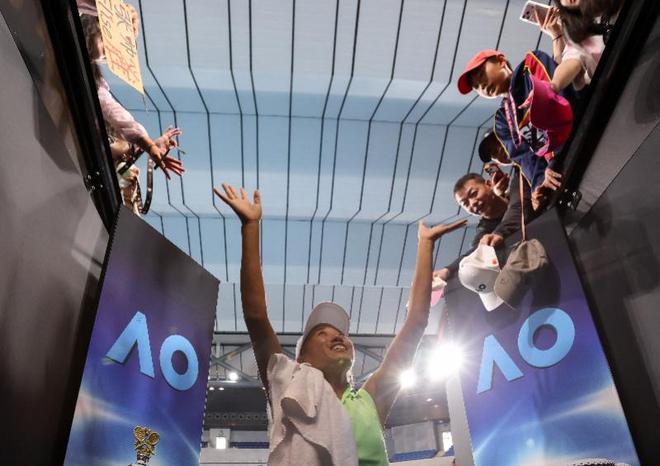 张帅在赛后与观众互动。 当地时间1月29日,在墨尔本进行的2026年澳大利亚网球公开赛女双半决赛中,张帅(中国)/梅尔滕斯(比利时)2比0战胜柴原瑛菜(日本)/兹沃纳列娃(俄罗斯),晋级决赛。 新华社记者 马平 摄