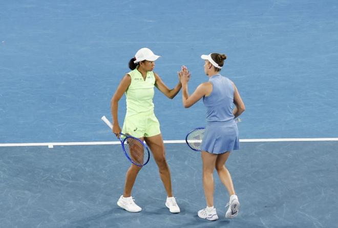 当地时间1月29日,在澳大利亚墨尔本进行的2026年澳大利亚网球公开赛女双半决赛中,张帅(中国)/梅尔滕斯(比利时)对阵柴原瑛菜(日本)/兹沃纳列娃(俄罗斯)。 新华社记者 马平 摄