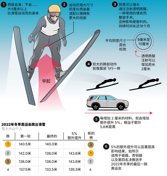 于是,这种离谱的传闻就应运而生了:既然衣服不能改,那我就改变“身体体型”。通过注射填充物让下体部位隆起,从而撑开比赛服的挡风面,增加升力。