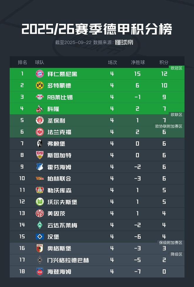 北京时间9月22日,2025/26赛季德甲联赛结束了第4轮的全部较量。