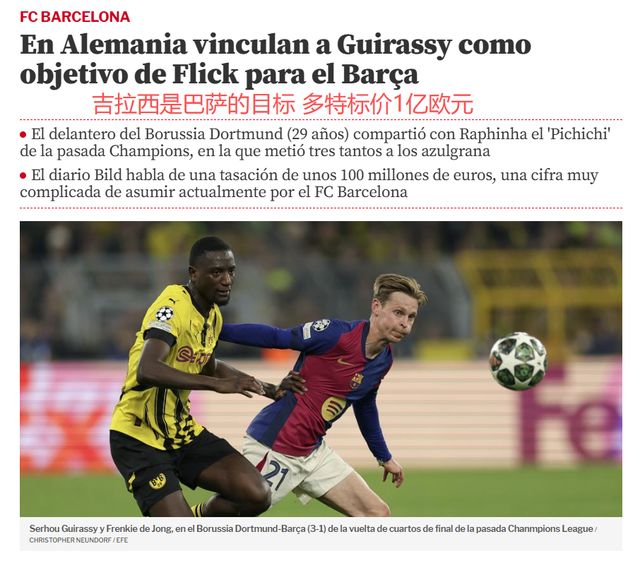 《图片报》指出,巴萨主帅弗里克非常欣赏吉拉西。29岁的吉拉西,是2024-25赛季欧冠金靴(打进13球,与拉菲尼亚并列)。吉拉西身高1米87,身体素质出色,擅长反击中的冲刺、反跑。去年夏天,吉拉西以1800万欧元加盟多特,1年多来56场比赛打进43球,效率极高。