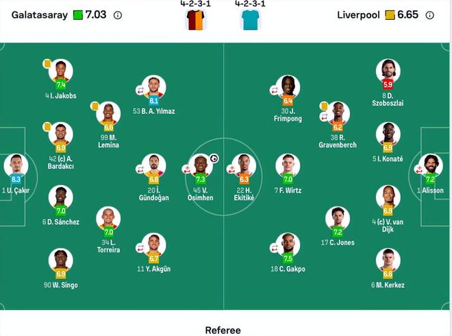 加拉塔萨雷首发:1-恰基尔、90-辛格、6-达文森·桑切斯、42-巴尔达什彻、4-伊斯梅尔-雅各布斯、34-托雷拉、99-勒米纳、11-阿克金(71’7-罗兰-绍洛伊)、20-京多安(75’8-萨拉)、53-伊尔马兹(85’17-埃尔马利)、45-奥斯梅恩(71’9-伊卡尔迪)。