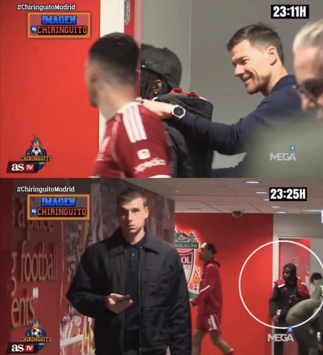 据西班牙六台拍摄视频显示,阿隆索在皇马和利物浦的比赛赛后与弗林蓬进行了14分钟的秘密会谈。据西班牙六台驻英国记者拍摄的赛后更衣室视频,阿隆索和弗林蓬进行了秘密会谈,从当