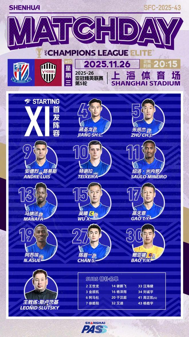 11月26日,2025-26赛季亚冠精英联赛东亚区第5轮,上海申花队坐镇主场迎战神户胜利船。在本场比赛中,申花队3球被吹,路易斯点射被扑,最终0-2不敌神户胜利船。 上海申花亚冠精英联赛