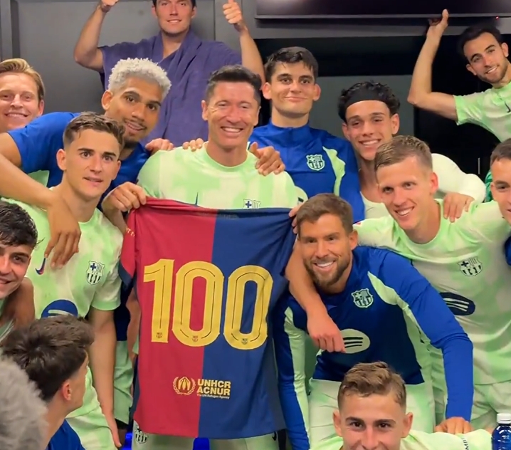 莱万加盟巴萨至今出战147场比赛,打进101球(20助),赛后他获赠巴萨生涯百球里程碑纪念球衣,并手拿球衣与队友们在更衣室内合影。