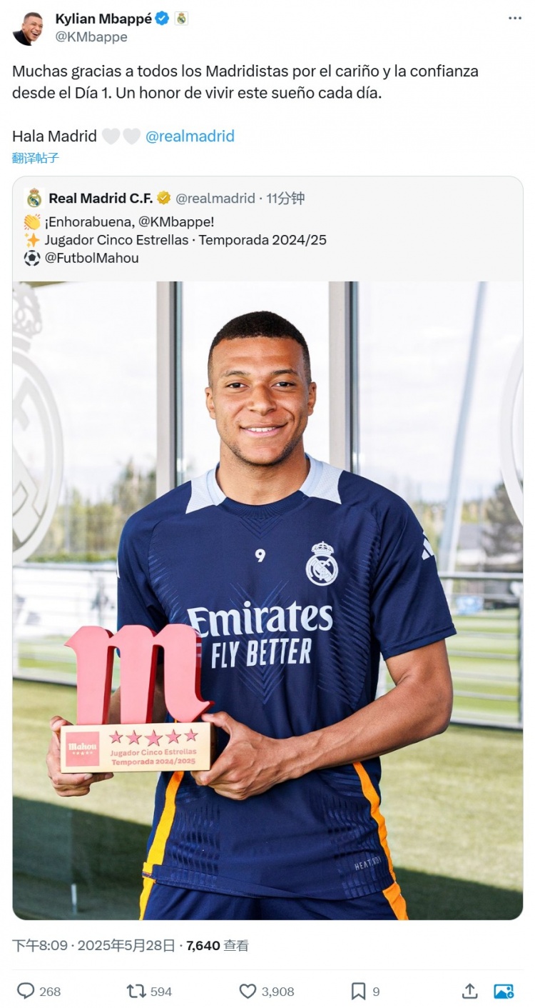 5月28日讯 皇马官方宣布,姆巴佩当选本赛季皇马队内最佳球员。随后,姆巴佩在社交媒体上转发了这一消息,感谢了球迷的支持。
