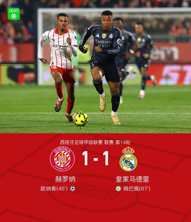 北京时间12月1日,西班牙足球甲级联赛第14轮,赫罗纳坐镇主场迎战皇家马德里。上半场,齐甘科夫助攻,欧纳希打破僵局。下半场,维尼修斯造点,姆巴佩主罚命中。全场比赛结束,皇马1-1战平