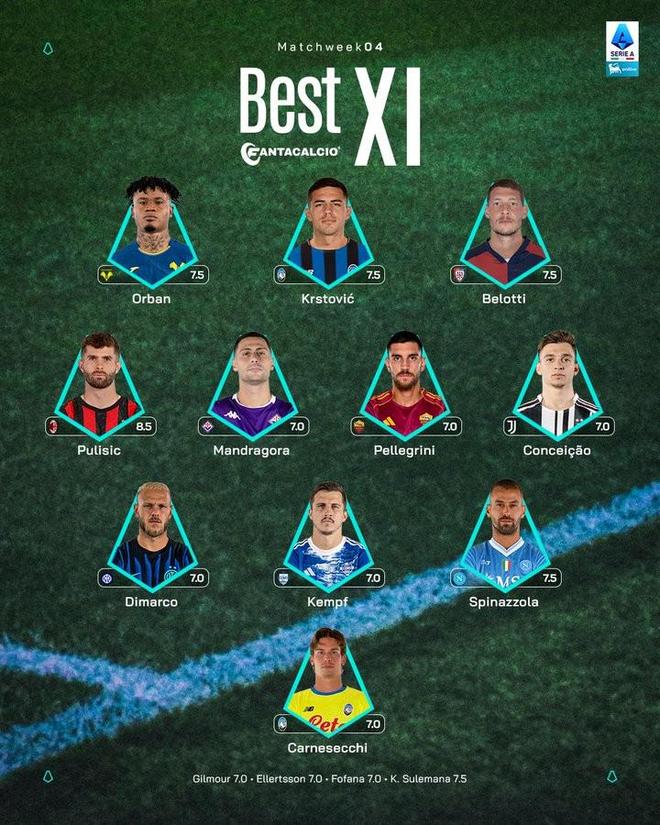 意甲第4轮最佳阵容:普利希奇、小孔塞桑、迪马尔科入选