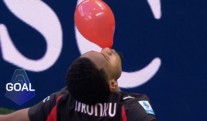 打入意甲处子球之后,米兰球员将恩昆库围起来不断拍打其头部,随后,恩昆库吹起了红色气球,庆祝自己的意甲处子球。