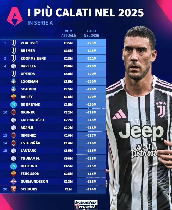 北京时间12月31日,德转列出了意甲2025年球员身价跌幅榜,尤文图斯包揽前三,弗拉霍维奇和布雷默下跌2500万欧元并列第一,库普梅纳斯下跌2200万欧元第三。意甲2025年球员身价跌幅TO