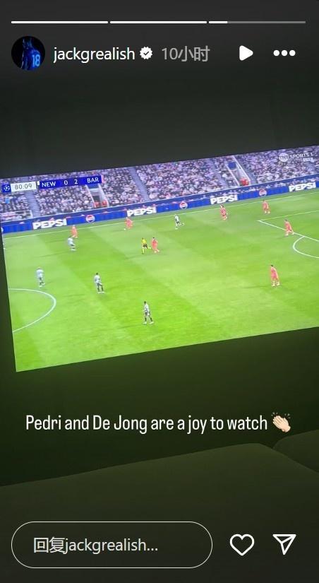 9月19日讯 格拉利什晒出他观看欧冠的动态,并称赞了佩德里和德容。
