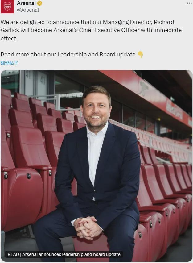 官方:阿森纳宣布俱乐部原总经理理查德-加里克被提拔为了CEO。