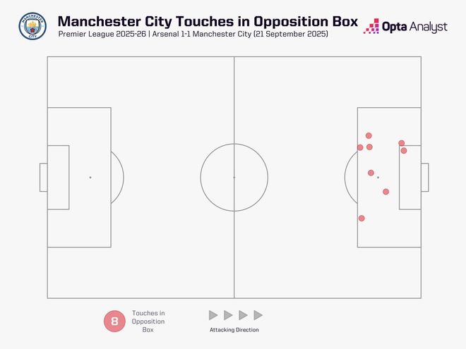 与阿森纳一役仅在对方禁区触球8次,为瓜氏曼城英超单场最少