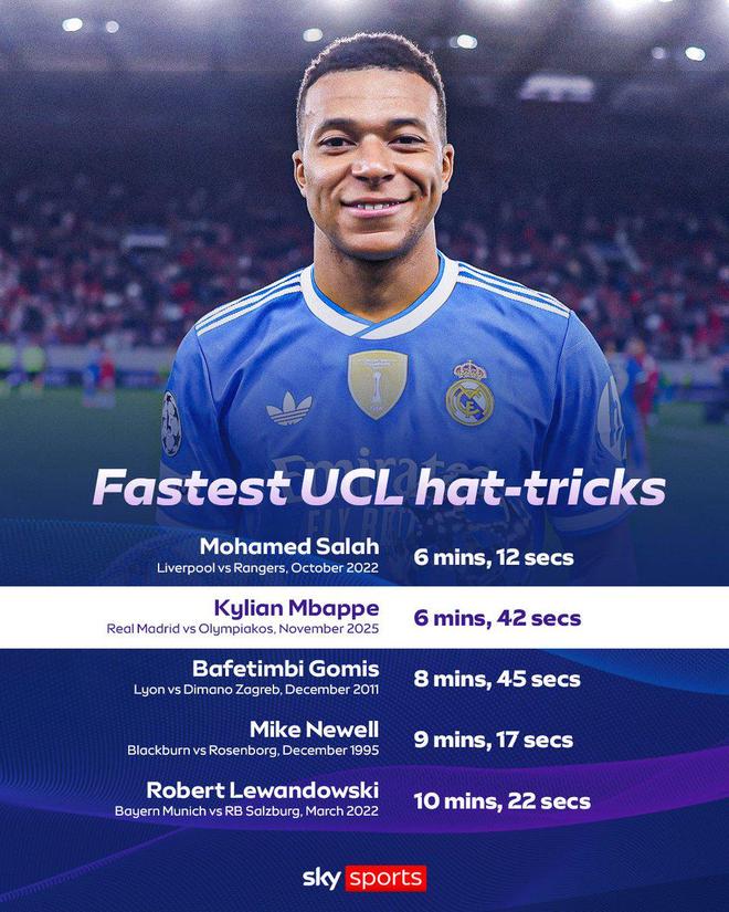 在周四凌晨欧冠联赛阶段第5轮比赛中,皇马客场4-3击败奥林匹亚科斯,其中姆巴佩打进4球,完成大四喜,并在6分42秒内打进了本场比赛个人的第三个进球。本场比赛,姆巴佩在6分42秒后就