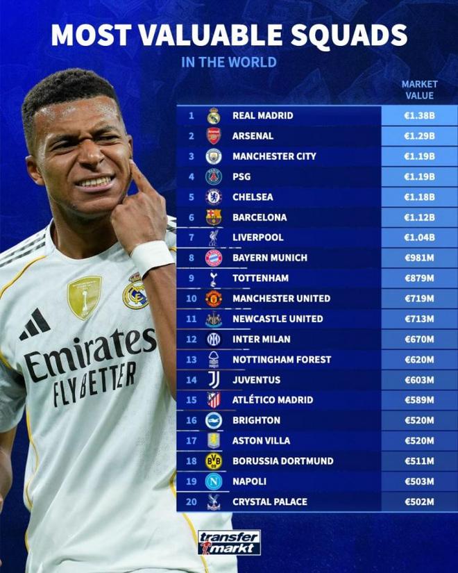 德转更新各联赛球员身价,并列出了俱乐部身价排名,皇马13.8亿欧居首阿森纳、曼城在此之后他们价值的确是太高了。