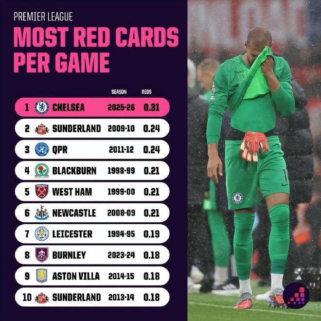 在赢下世俱杯冠军之后,切尔西的新赛季被很多人寄予厚望,没想到他们却跌入了“红牌陷阱”。他们爱英超前13轮拿到了4张红牌(场均0.31张),这个效率如果保持下去,甚至可以创造英超新纪录。