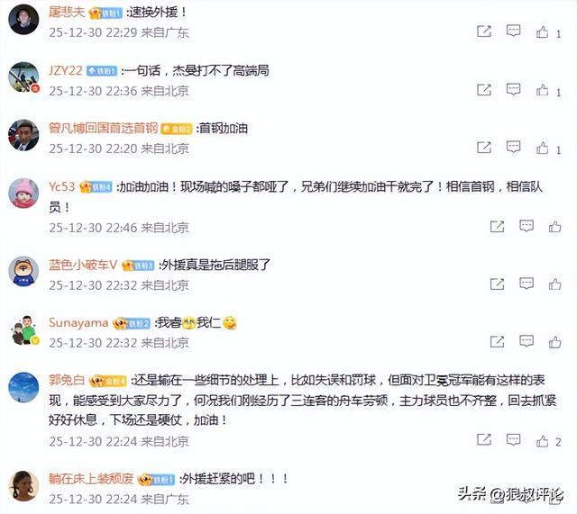 场场让赵睿周琦那么打怎么可能呢!!天南地北的三连客场,再加上连续三场高强度比赛,确实要累死了….期待下场阿基和小曾的回归!再说一万遍既然争冠是目标,那外援问题就是重中之重!别浪费那么好的国内球员!最后希望大家2026年健健康康,一定能拼到那个冠军。