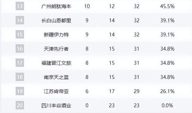 底部阵营惨烈厮杀:天津、福建、同曦三队同为8胜15负,江苏(7胜16负)与四川(6胜17负)则深陷泥潭,保级压力山大。