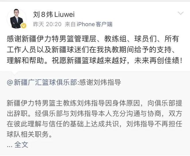 来源:新疆日报2月13日,新疆广汇篮球俱乐部通过微博发布公告,称主教练刘炜因身体原因辞职,不再担任球队相关职务。全文如下:随后,刘炜转发该博文,并表示:“感谢新疆伊力特男篮管理层