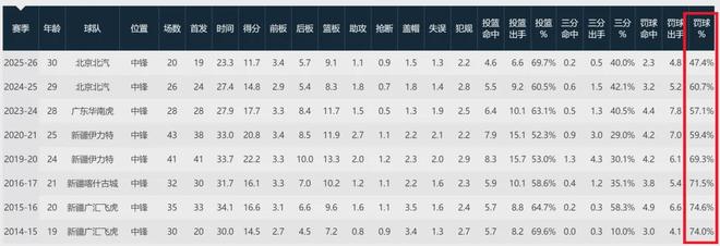 来看看周琦生涯每个赛季罚球命中率:74%,74.6%,71.5%,69.3%,59.4%,57.1%,60.7%,47.4%。从生涯第三年开始,几乎一路下滑。作为对比,王哲林本赛季罚球命中率67%,生涯最差的赛季罚球命中率56.6%。