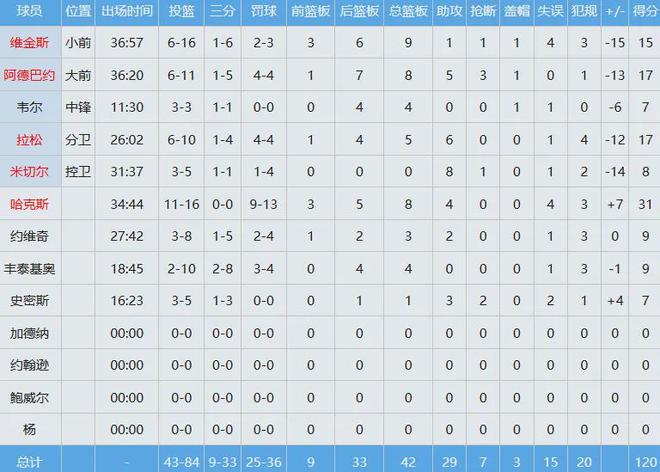 东契奇贡献29分11板10助三双,里夫斯26分11助两双到手,拉拉维亚25分进账,合计80分。三个白人球员,撑起了湖人的现在,目前紫金军团以5胜2负高居西部第三。湖人全队数据如下:热火全队