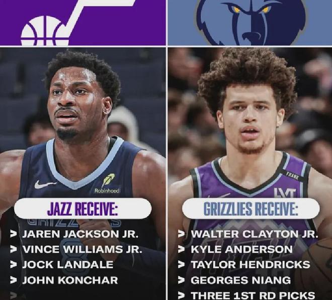 今年交易截止日前,爵士送出克莱顿+李凯尔+亨德里克斯+尼昂+三个首轮签,从灰熊挖来3J+孔查尔+兰代尔+小威廉姆斯。
